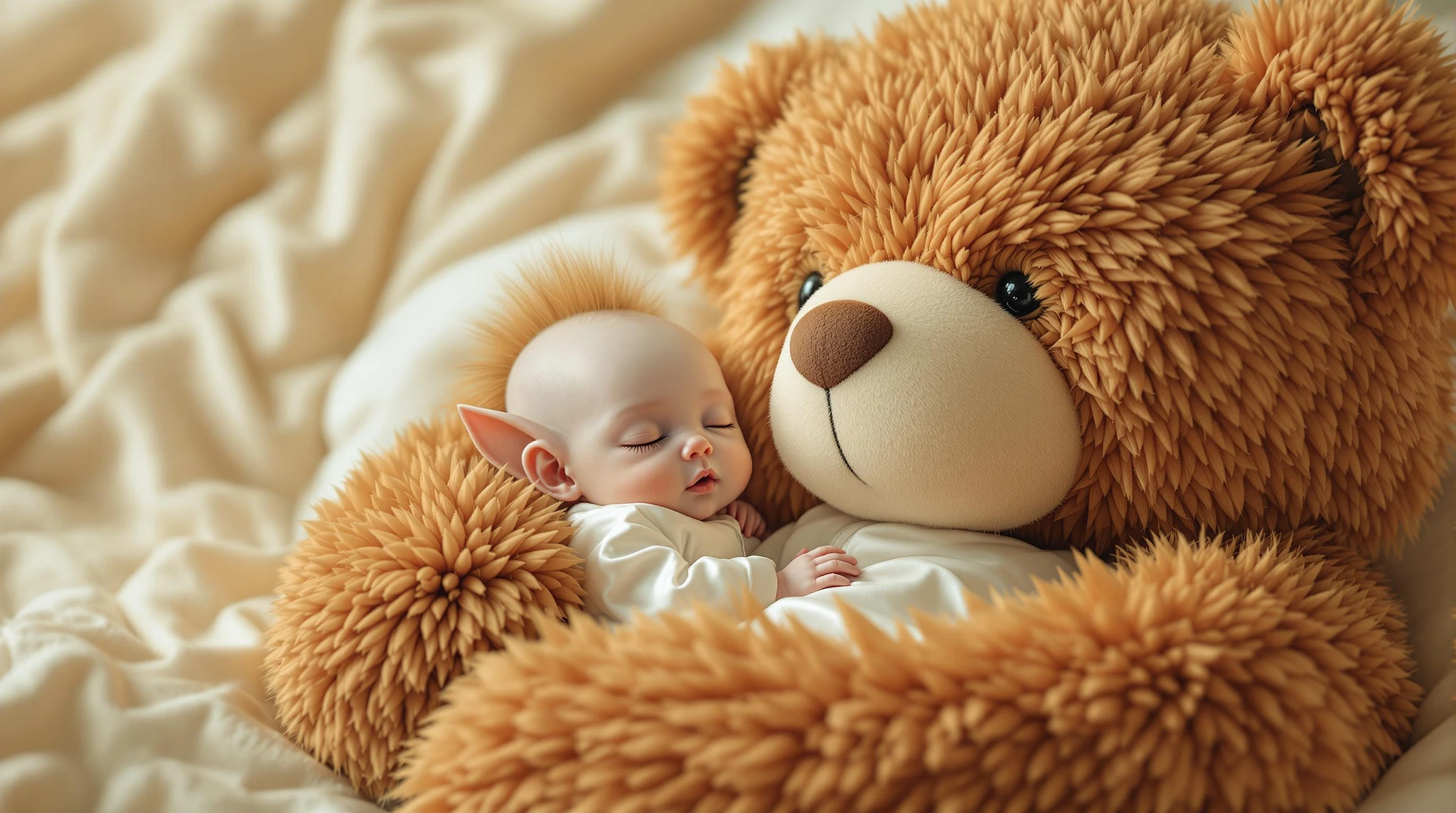 in the arms of a cuddly, oversized teddy bear, a beautiful and cute extraterrestrial baby with an elongated head, large almond-shaped eyes, and a small nose, topaz color hairs in a spiky duvet, pointed ears, wearing a silk white adorable pyjamas, asleep, the teddy bear is much larger than the baby, the thick fur of the bear is in a red earth tones colors, set against a soft, cream and white tone background that adds warmth and coziness to the scene, the atmosphere is very charming, and full of love and happiness, uhd beautiful details and textures, perfect image characters photorealistic quality