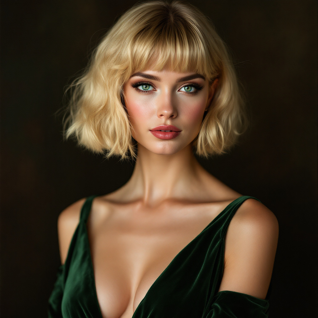A woman in her thirties, with striking features: blonde hair, piercing green eyes, a prominent forehead, a large straight nose, and defined cheekbones. Her bob hairstyle is elegantly styled with bangs, complementing the evening makeup she wears. She dons a luxurious floor-length dress, crafted from dark green velour. This image, whether a painting or photograph, captures the woman's beauty in exquisite detail, showcasing high quality and attention to intricacies.