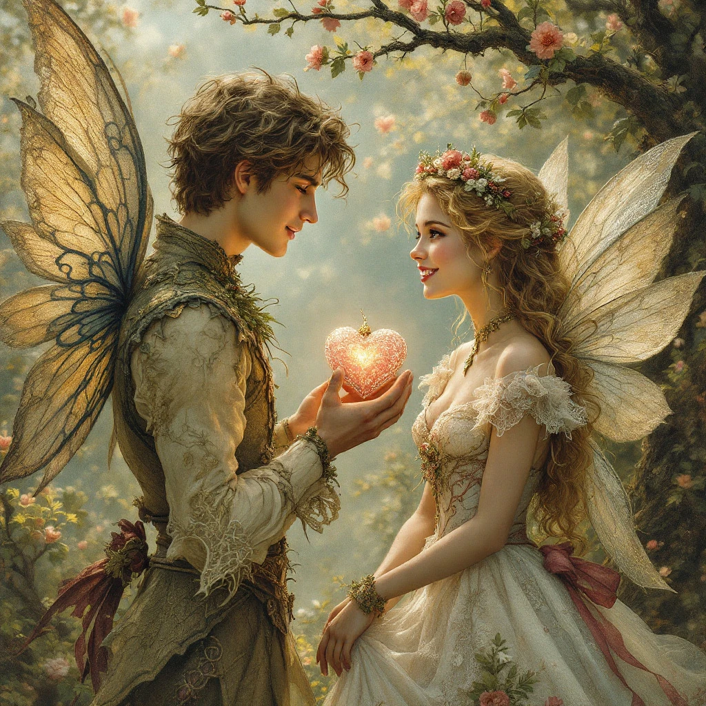 in the style of josephine wall, james c christensen, and brian froud, of a handsome young fairy man holds out a pretty lacy valentine shaped bauble to a sweet young lady fairy, she smiles sweetly as they gaze at each other