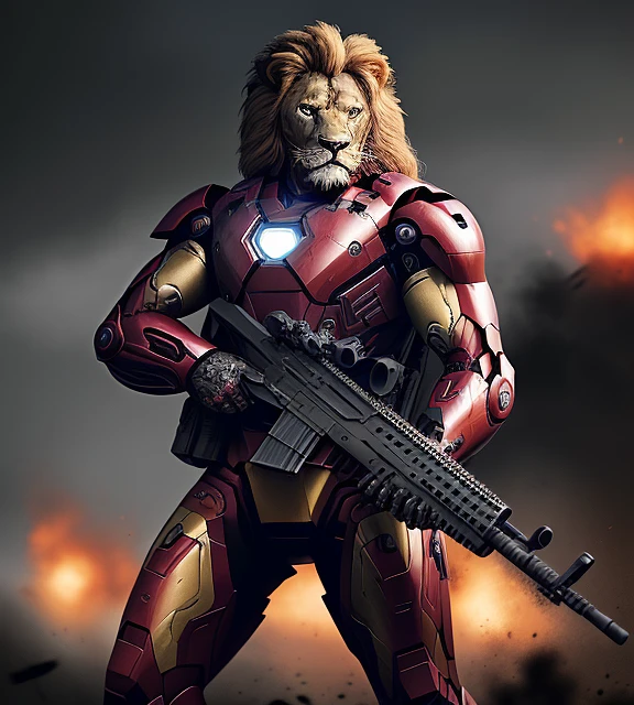 Battle-scarred angry iron man lion army wearing black ops uniform, holding carbine rifle, anthropomorphic, super detail, ultra hd, 8k, real life, maximum facial detail, cinematic lighting --ar 9:16 --q 2 --s 750