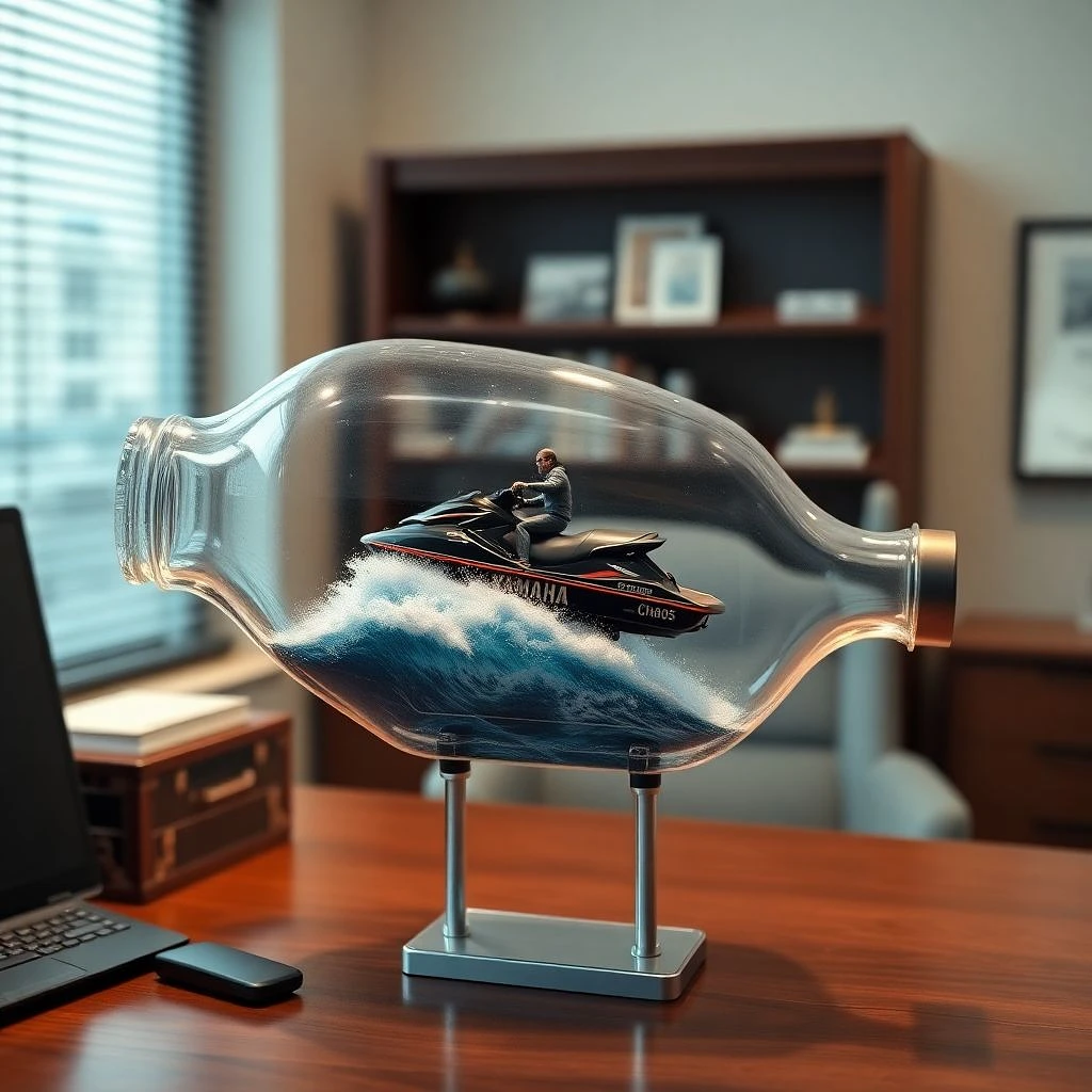 A realistic ship in a bottle, featuring a black Yamaha 3 seat jet ski jumping a big wave ((Chaos) ) written on the side. The scene includes cresting waves, capturing a vibrant, dynamic moment. The bottle sits on a stand as a decoration on a professional-looking desk in a well-appointed home office. Highly detailed, ultra-realistic, cinematic, 8k Negative prompt: text, logos, watermarks, out of frame, ugly, extra limbs, extra hands, extra feet, extra fingers, bad anatomy, yacht bigger than bottle, 1:1 bottle Negative prompt: text, logos, watermarks, out of frame, ugly, extra limbs, extra hands, extra feet, extra fingers, bad anatomy, yacht bigger than bottle Negative prompt: text, logos, watermarks, out of frame, ugly, extra limbs, extra hands, extra feet, extra fingers, bad anatomy, yacht bigger than bottle