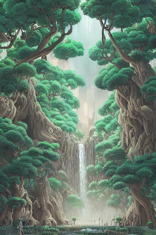 a massive tree in the center of the frame with city buildings around it, life is based off this tree and revolves around it, high detail, concept art, beautiful, typography river waterfall, by kaws, studio ghibli by tim hildebrandt, michael whelan, background environment, sharpen, an intricate, elegant, highly detailed digital painting, concept art, smooth