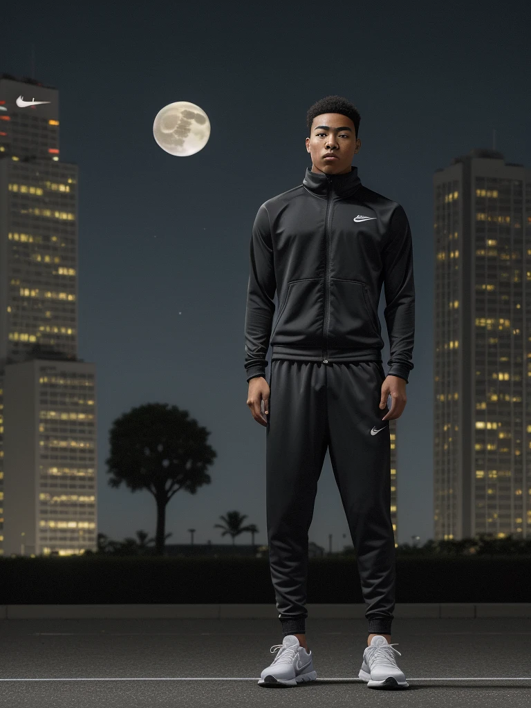 young man moai head using nike tracksuit, night time, big full moon in the background above the buildings, very detailed, ultra realistic, shoot with Sony Alpha a7R IV FE 70-200mm f/2. 8 GM OSS lens ISO 100, 8k, high definition, matte painting –w 2176 –h 3840 –iw 1 -v 5 --s 1000 --ar 7:4 --raw