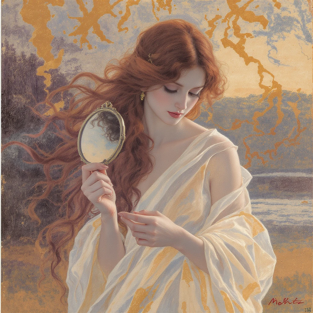 "Ultra-detailed pastel artwork on paper style, inspired by Teodor Axentowicz’s early 1900s works. A mysterious woman with flowing reddish hair and ethereal, captivating features, holding a small mirror delicately in one hand. A light, translucent fabric drapes softly across her figure, blending harmoniously with the background. Her hair moves like soft glowing strands, merging naturally with a dreamy backdrop of muted blues, oranges, and warm earthy tones. The atmosphere is poetic and serene, emphasizing softness, gentle light, and the delicate texture of pastel strokes. Focus on her introspective expression, subtle contrasts of light and shadow, and a mystical, melancholic aura. "