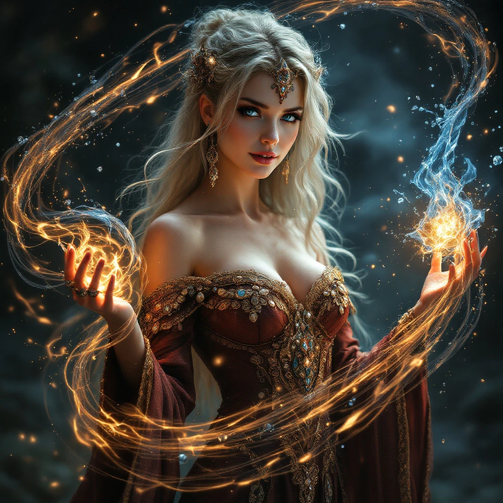 A stunning slim female wizard stands poised in a magical dark fantasy realm, casting a mesmerizing spell with elemental energies swirling around her. She wears an alluring off-shoulder costume adorned with elaborate rings, showcasing intricate details and textures. Her beautiful, fair skin glows under soft, ethereal lighting, emphasizing her enchanting blue eyes and captivating smile. Elements of fire, water, wind, and ice dance in a perfect dynamic composition, creating a breathtaking, ultra high-resolution masterpiece.