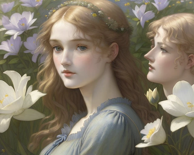 woman insipired by Lucien Lévy-DhurmerLe Silence and Albert-Émile Artigue Fleurs de Printemps and Days of Creation (Third) Edward Burne-Jones and Albert Lynch The last rays and Edouard Bisson The Three Grace's and Il canto dell'allodola, Sophie Anderson beautiful and detailed artwork, detailed face, no blur, very detailed face, very detailed eyes, realistic, hyperrealistic