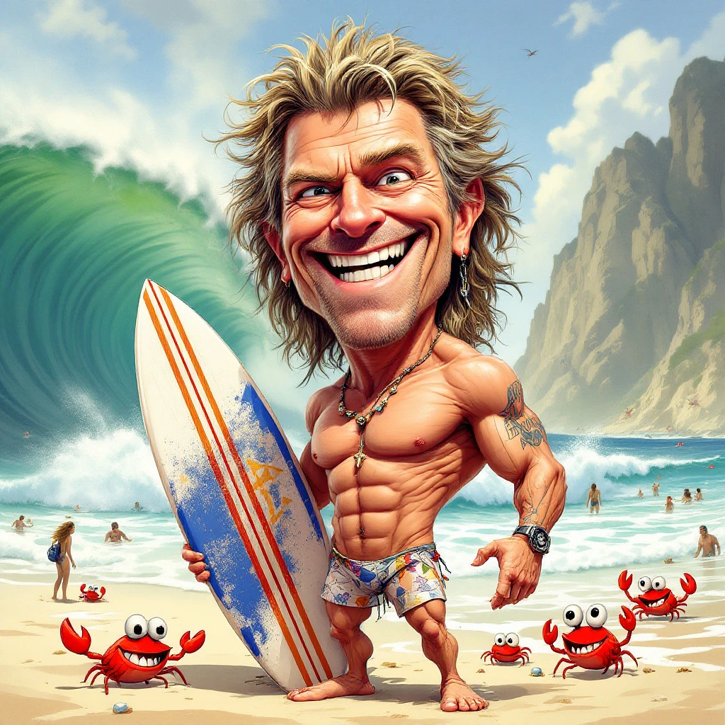 a humorous, exaggerated caricature of Jon Bon Jovi. His face has oversized, intense eyes with one eyebrow raised high and a huge, toothy grin. His muscular body is exaggerated to immense proportions. He wears a tiny, comically tight swimsuit and holds an enormous surfboard. The background features a lively beach scene with giant waves, amused beachgoers, and playful cartoon crabs.