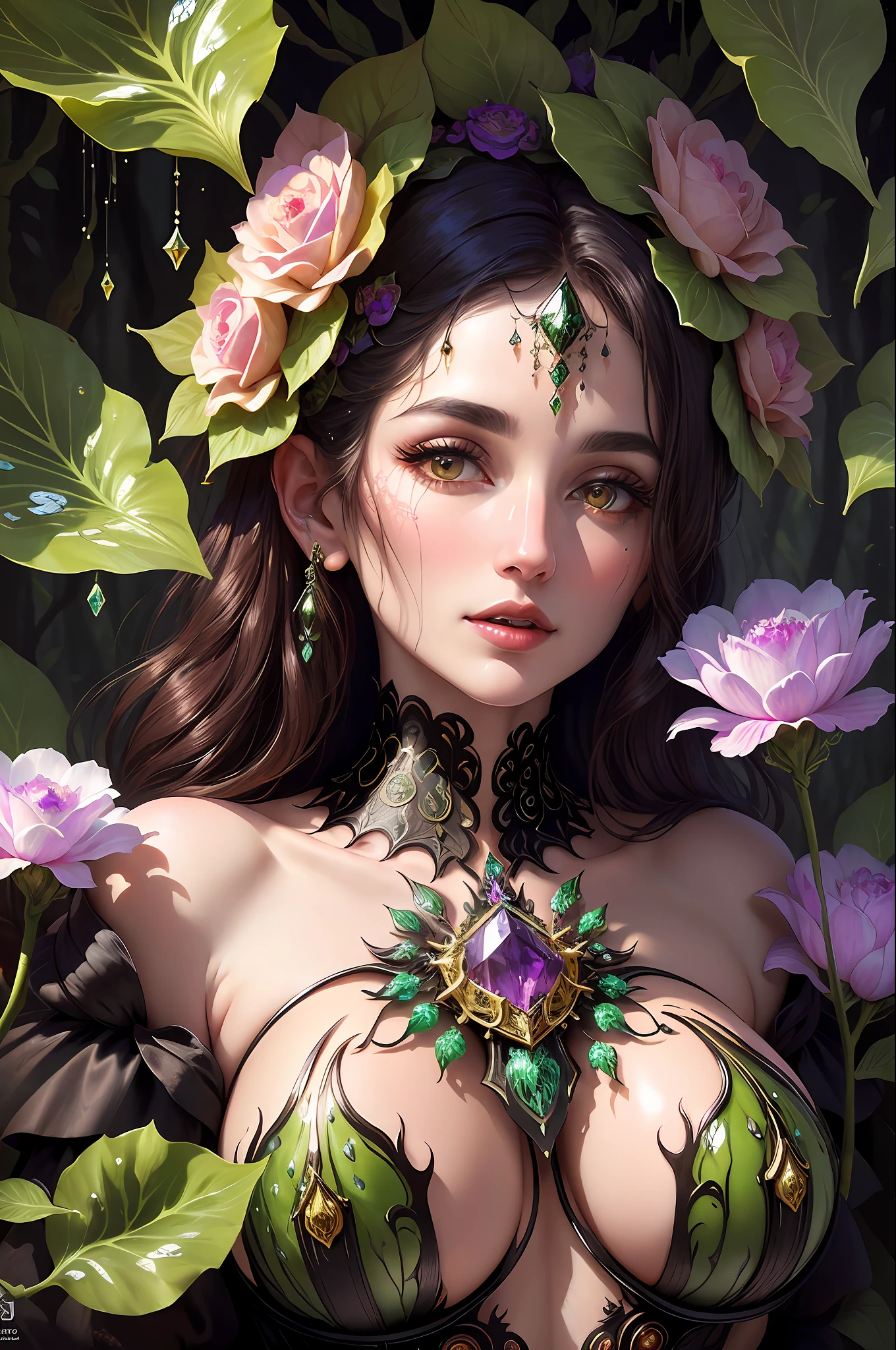 Rosen maiden, (masterpiece, best quality) , (illustration) , strange mycosis lush forest, transparent goo, caustics, crystals, close-up, intricate details, dark background, sparkling spores, rainbow crystals, dark