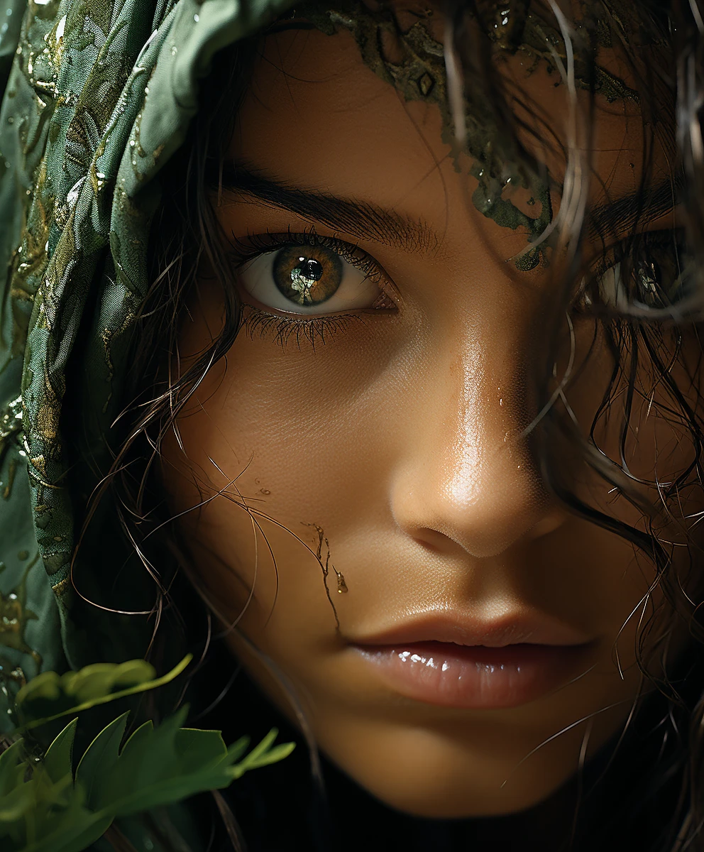 a woman with green eyes and leaves covering her face, in the style of realism with fantasy elements, daz3d, fine art realism, magic realism, exotic realism, close up, fairy tale --ar 71:85 --s 750 --v 5. 2