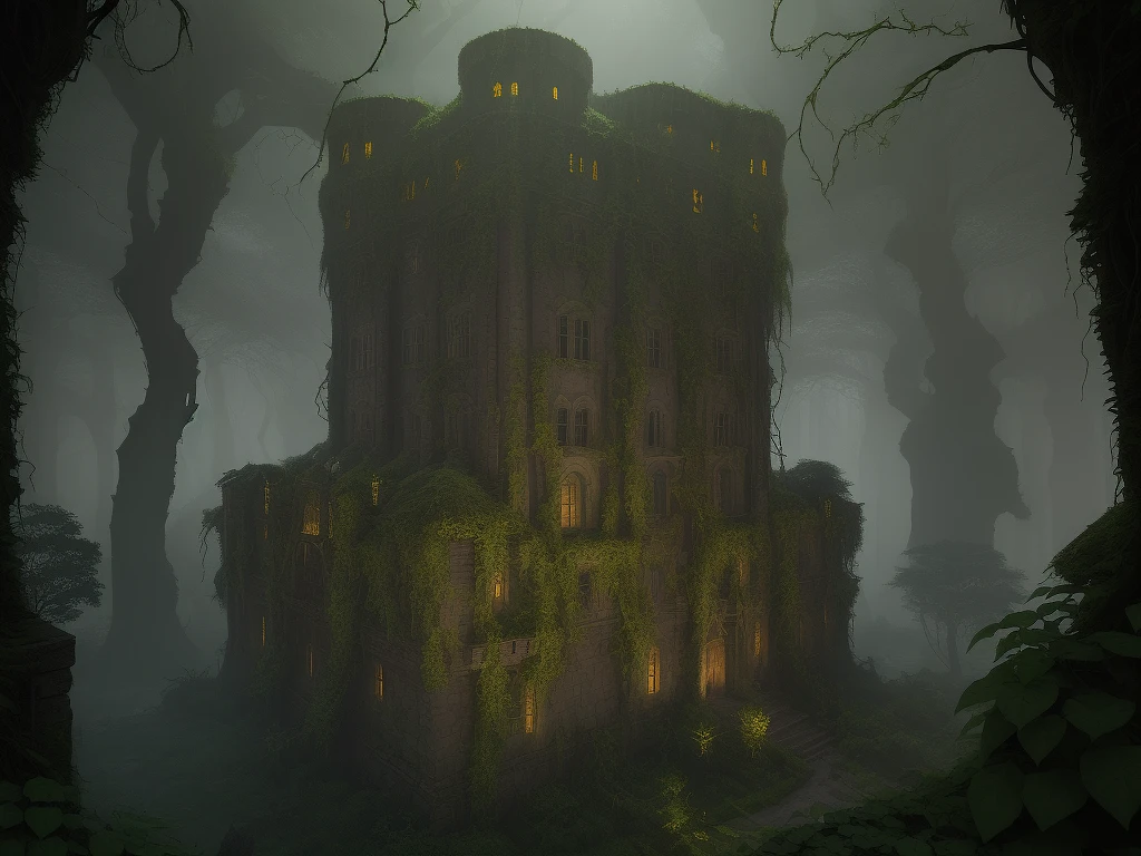 giant ancient castle in an forest with some ivy plants on the walls, cinematic, epic, dramatic lighting from above, dark, vines, fantasy, dust, unreal engine, octane, highly detailed, concept art, dark, super realistic --ar 16:9 --s 5000