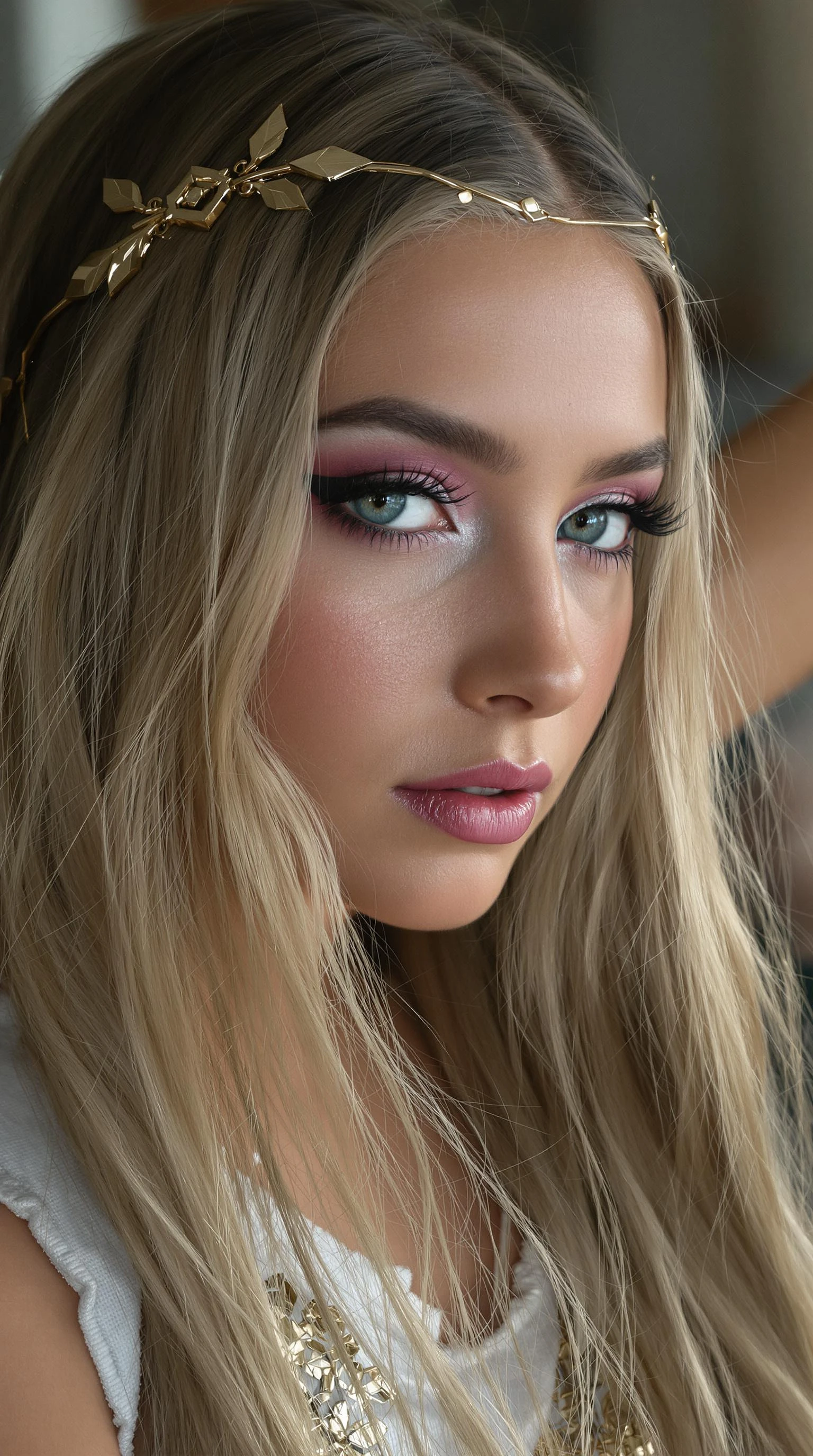 a professional photo of a exceptionally beautiful girl in the world, (young tween) (futuristic) , (masterpiece) , (realistic) , (perfect anatomy) , (Full body viewing from head to feet) , score_13, score_28_up, score_37_up, source, with extremely long dark Ash Blonde hair, long hair, flawless olive skin, thick black eye liner, extra long eye lashes, light pink blush, violet eye shadow, flawless light olive skin, gold small headpiece, fantasy theme, mystical, captivating extremely detailed large beautiful brilliant Forest Tea red-green-blue-silver-brown-golden-grey eyes, serene expression, magical atmosphere, warm colors, high depth of field, gentle expression, 8k, (high res) , ultra-detailed, photo-realistic, full image view, full body view, front view, highly detailed, volumetric, dramatic lighting