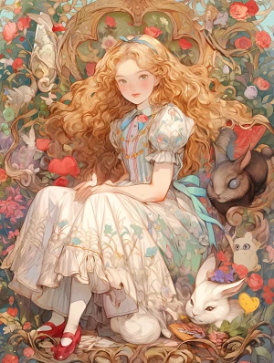 Alice from Alice in Wonderland, Curious exploration stance with whimsical creatures releasing wonder behind, Pastel colors High contrast dreamy usage of light and color, fantastic in the style of Rebecca Guay, Imaginative illustrations surreal compositions, Enchanting cover, Alice in Wonderland::2 --ar 3:4 --niji 5