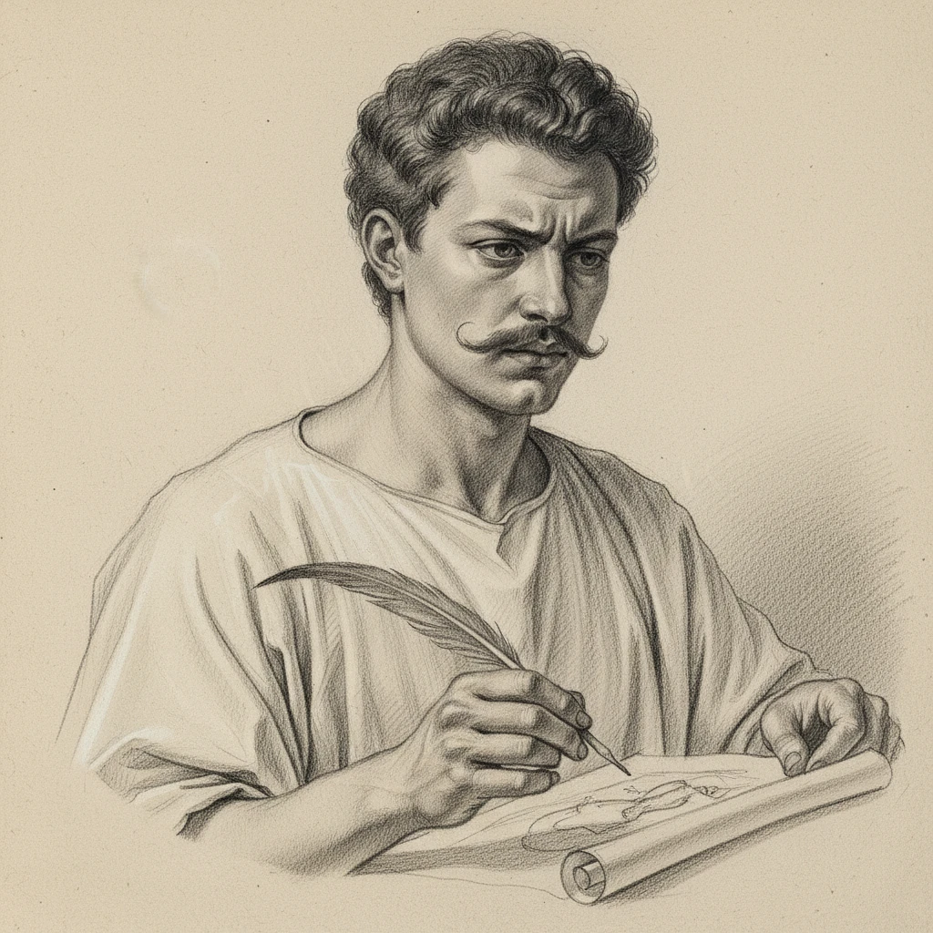 younA middle-aged man with a strong, slightly heavy build, presenting a calm and serious expression. His skin is tan, with a subtle sheen, suggesting either natural oiliness or soft lighting. He has a short, neatly trimmed haircut, revealing a full head of hair with a hint of natural greying on the sides and around the temples, giving it a salt-and-pepper appearance. His dark, deep-set eyes are a prominent feature, conveying thoughtfulness or a slight weariness, with well-defined but not overly thick eyebrows matching his hair color. His nose is straight and prominent, with a broad base, and his lips are naturally full, forming a thin, straight line in his neutral expression. There's a subtle hint of stubble on his jawline and chin, suggesting a recent shave or a very short beard. The man's face shows some fine lines around his eyes and forehead, consistent with his age, adding to the realism. He is wearing a crisp, unbuttoned white collared shirt, revealing a hint of his chest, which adds to a relaxed yet somewhat formal look. The fabric of the shirt appears to be cotton or linen, with visible creases indicating it's been worn. The lighting is soft and even, possibly from an indoor source, casting minimal shadows and highlighting the contours of his face. The background is simple and slightly out of focus, likely a light-colored wall, ensuring the focus remains entirely on the man. Photorealistic, ultrarealistic, hyperrealistic, ultra-detailed, 8K, RAW photo, cinematic lighting, sharp focus, natural skin texture, Canon EOS R5, 85mm f/1. 8, ISO 200, F/2. 0, shallow depth of field. g man with mustache and short hair, wearing white tunic, drawing in the style of Da Vinci, black & grey, on a white background --ar 9:10 --style raw --v 5. 2