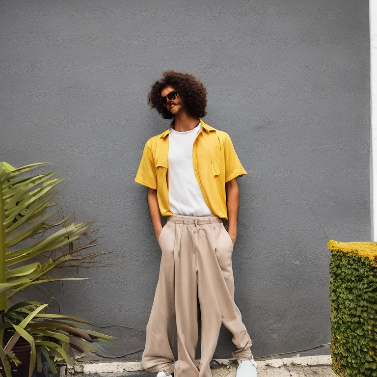 A young man, with a Arabian appearance and tousled curly hair, leans against a yellow storefront, his nonchalant pose evoking a laid-back, tropical aesthetic. He sports a light, botanical-printed shirt, partially tucked into relaxed taupe trousers. His vintage sunglasses add a touch of cool to the casual, yet thoughtfully curated, summer-streetwear look --ar 4:5 --style raw --stylize 50 --v 6