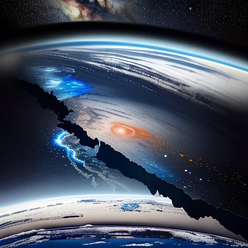 Der Weltraum wird in der Darstellung von oben betrachtet. Die Erde erscheint als strahlender blauer Planet mit sanften weißen Wolkenformationen, die über die Oberfläche gleiten. Um die Erde herum schweben leuchtende Raumstationen, darunter die imposante NISS (New Interstellar Space Station) sowie die eleganten Luna Stationen 1, 2 und 3. Diese Raumstationen bilden einen Kreis um die Erde und verleihen dem Bild eine harmonische Symmetrie. Der Mond schwebt ruhig in der Ferne und vervollständigt das Bild einer faszinierenden kosmischen Landschaft. 8k