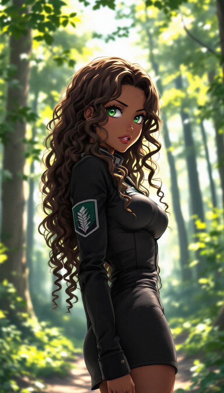 attack on titan anime style, black girl, green eyes, curly brown hair, black survey corp uniform, hourglass body, nude pink lips, long lashes, sharp eyes, sunlight, forest background, beautiful, adult, extremely long hair, floor length hair, full body, spiral curls, sharp teeth