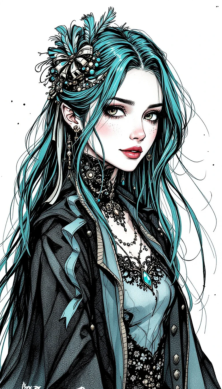 A steampunk era ink illustration with messy lines and ink bleed. A woman with long, flowing, turquoise hair and kind, hazel eyes, is wearing a dark, flowing coat with sheer fabrics, adorned with ribbons and lace. Her hair is styled into a loose and elegant style, with various ribbons, feathers, and beads acting as hair clips. The illustration is designed to be steampunk inspired, with a focus on grace and expression in a League of Legends art style, using flowing lines and detailed textures.