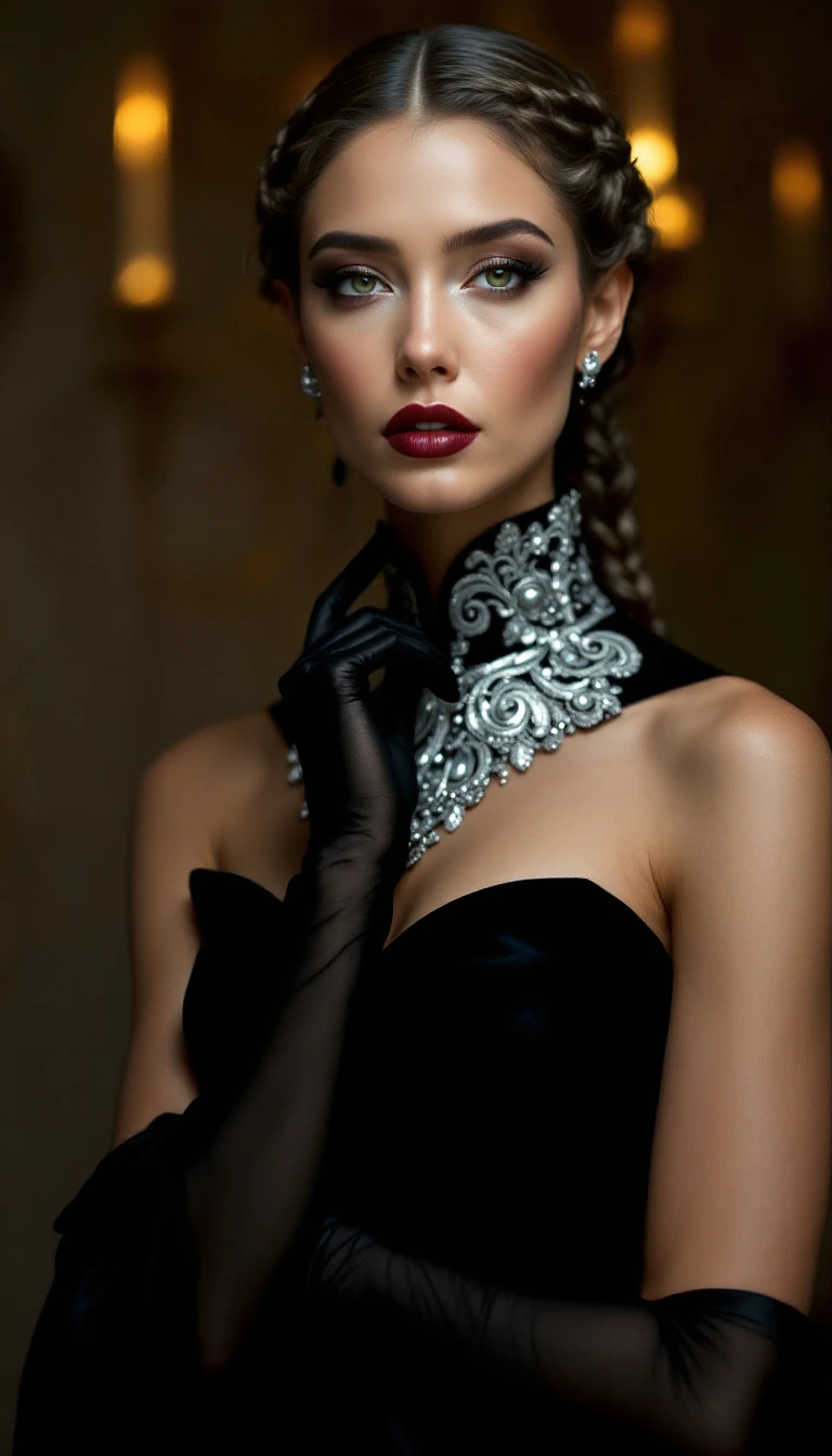 1. A captivating, full-figure portrait of a woman, positioned at a low angle, emphasizing her commanding presence. She wears a high-collared, dark sapphire gown, embellished with silver filigree, paired with sheer black gloves that reach her elbows. Her gaze is piercing, conveying unwavering resolve, and her braided hair is intricately styled. The artistic style blends the dramatic lighting of Caravaggio with the opulent detailing of Gustav Klimt, giving the image a regal and timeless quality.