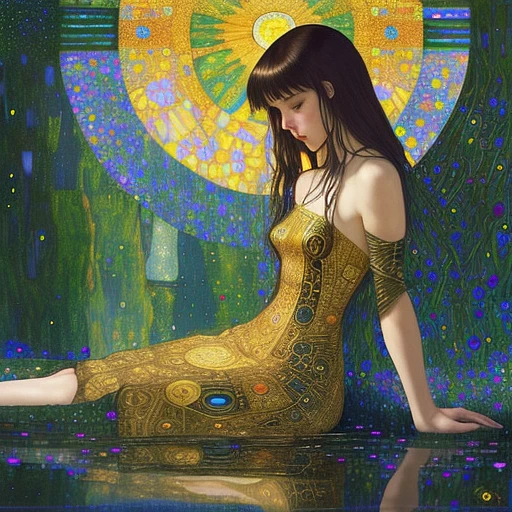 ((Waterhouse) ), Klimt style. Perfect profile beautiful sit down full body with a ((short dress) ) ((woman) ) in a surreal and mind-blowing planet, full of translucent ((big drops) ) falling, reflecting the landscape. lots of surreal flowers and mind-blowing birds of immense shapes and colors. Sun. Several moons. XIV century style. Hyper-detailed hyper-realistic photo-fantasy ornate meticulously detailed, muted colors in, meticulous, intricate and highly detailed illustration by Bosch. ornate, meticulously detailed, muted colors, meticulous, intricate, highly detailed. Cinematic light. Work of art. Extremely detailed