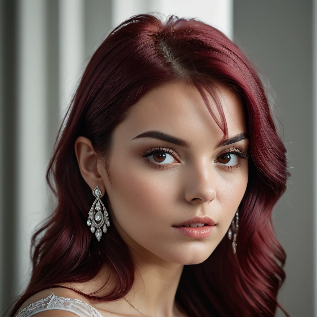 Cover photo featuring a woman model, burgundy color hair, 300mm f/5. 8, light silver and white, optical, soft-focused realism, ultra detail, natural light