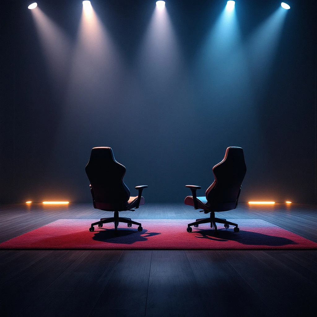 1440 x 880 main background image with shade #1E1E2E in the image there should be 2 gaming chairs facing the center but not covering it, their place should be on the sides because the text is in the center, the image is on top there should be lighting for the entire width of the picture by the height of the lighting, about 340 pixels.