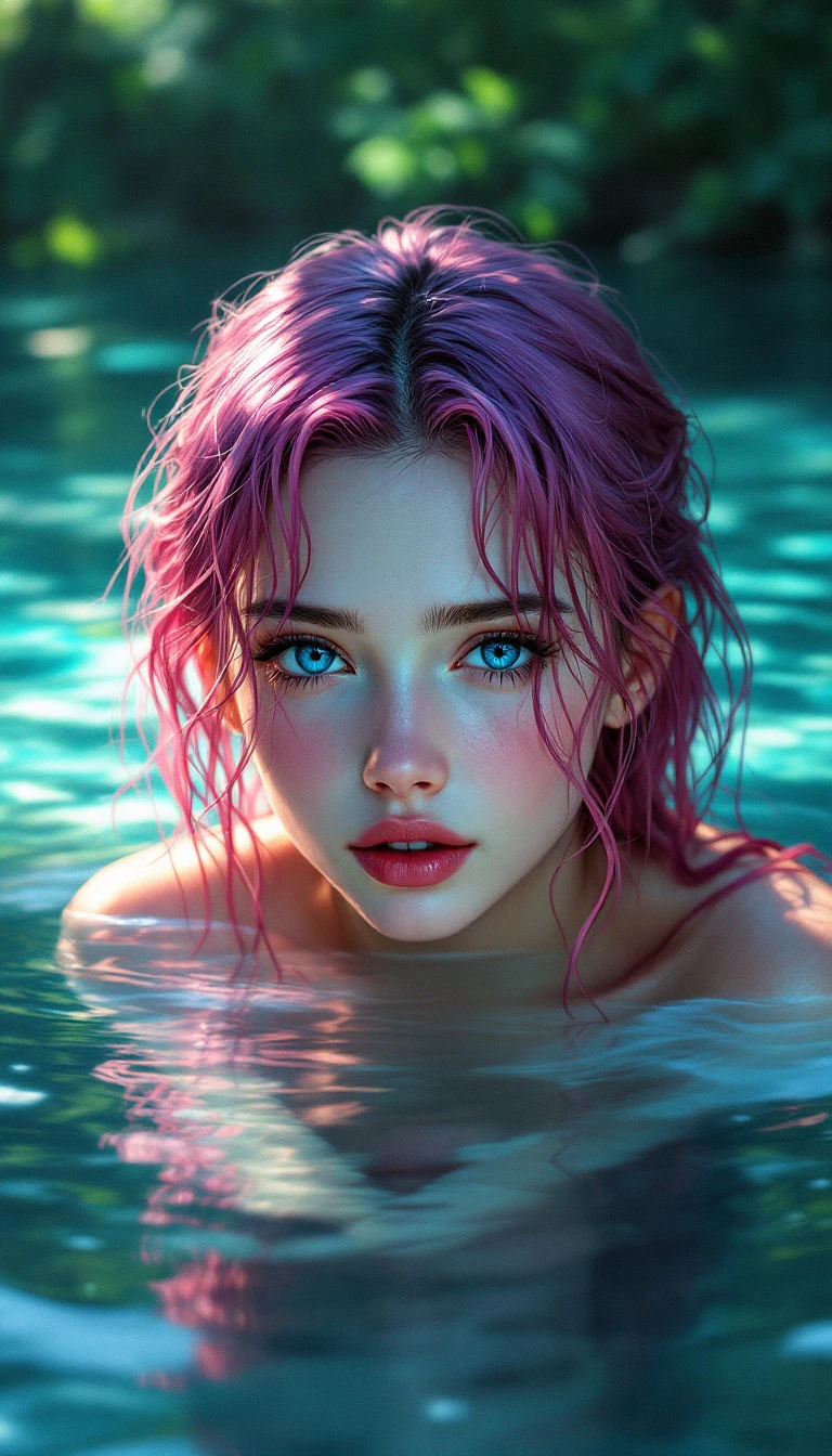 **Hyper-realistic anime-inspired digital painting, cinematic composition, 8K resolution. ** A **mesmerizing young woman with striking blue eyes and vibrant pink hair** partially submerged in a crystal-clear forest river. Her **wet hair clings to her face and shoulders**, strands shifting in the water. Her expression is **gentle yet intense, with a soft, curious gaze**, subtle blush on her cheeks, slightly parted lips. The **lush green forest reflects on the water’s surface**, with **sunlight filtering through the dense foliage, creating dappled patterns of light and shadow**. The **water is pristine and slightly rippled**, reflecting her image with a slightly distorted yet dreamlike effect. She wears **a delicate, translucent fabric draped over her shoulders**, barely visible beneath the water’s surface, accentuating the ethereal and mysterious atmosphere. **Tiny droplets of water glisten on her skin**, enhancing the realism. The painting style blends **anime aesthetics with high realism**, featuring **smooth gradients, cinematic lighting, and ultra-fine detailing**. The **bokeh background softly blurs the surrounding forest**, drawing focus to the character. The composition is **balanced and immersive**, capturing **a serene yet magical moment in nature**, evoking a sense of wonder and tranquility. **Perfectly harmonized colors**, from the cool greens of the forest to the soft pink and blue hues of her hair and eyes, create a **captivating visual experience**. A **masterpiece of nature, beauty, and fantasy realism**, exuding an ethereal and dreamlike presence.