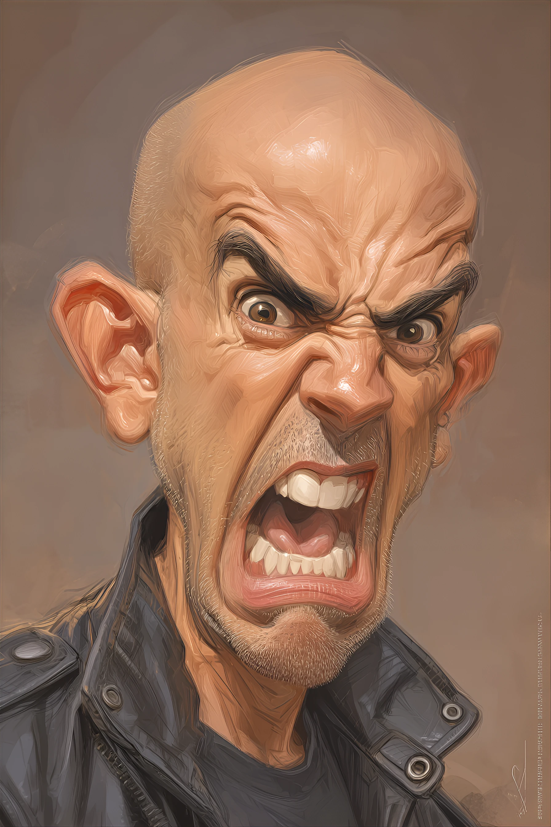 funny caricature, enraged bald man, male, 50 years old, red-faced, vein-popping, teeth-gnashing, oversized bald head with exaggerated angry features, bulging neck veins, muscular, tense body type, furrowed brow, bulging eyes, clenched teeth, furious expression, caricature, the enraged man is wearing a black leather jacket, accessorized with nothing visible