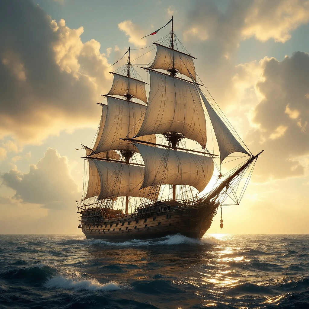 Photo of a ultra realistic sailing ship, dramatic light, pale sunrise, cinematic lighting, battered, low angle, trending on artstation, 4k, hyper realistic, focused, extreme details, unreal engine 5, cinematic, masterpiece, art by studio ghibli, intricate artwork by john william turner
