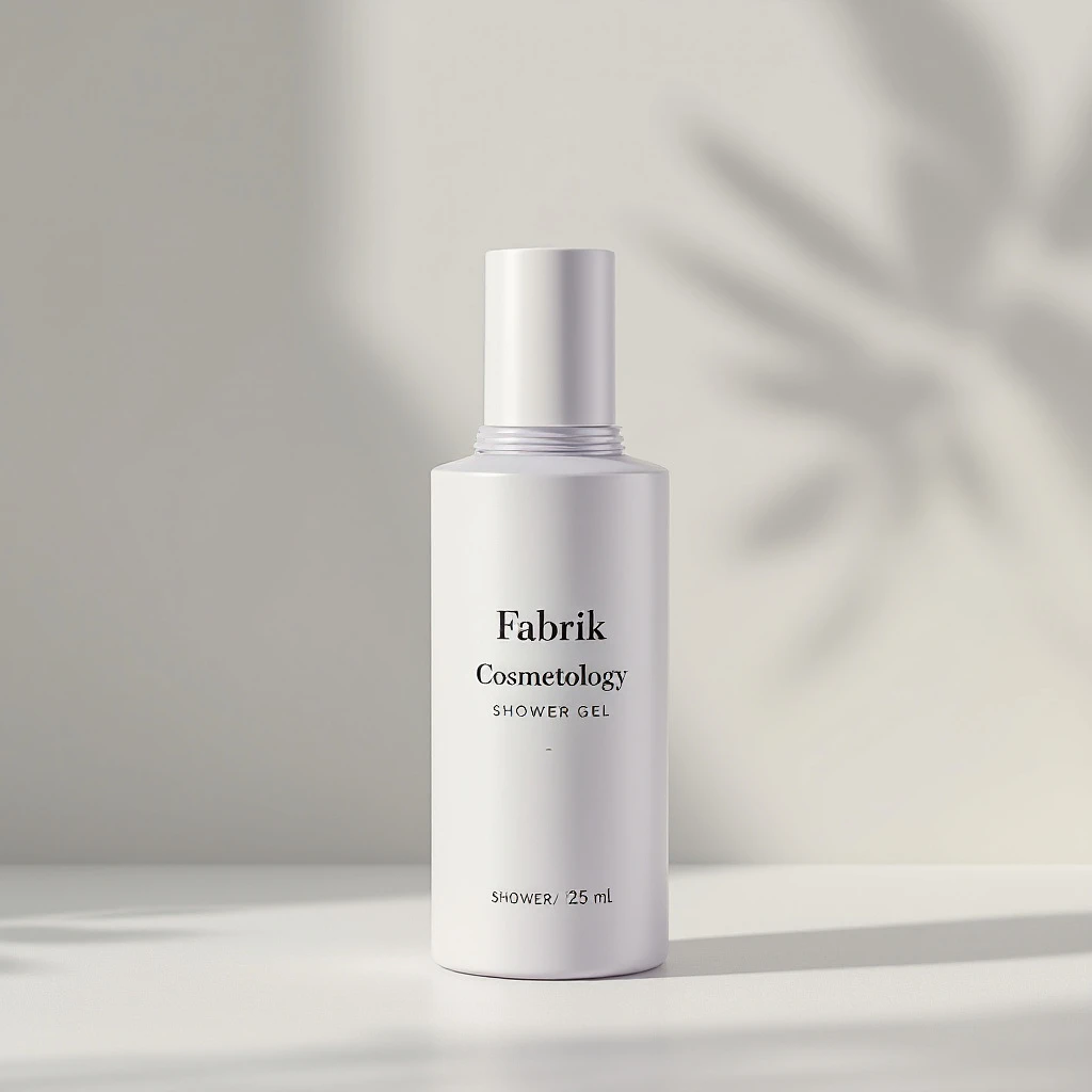 A sleek and modern shower gel bottle design, branded "Fabrik Cosmetology", standing upright on a clean, minimalistic background. The bottle is elegant and ergonomically shaped, with a matte finish and subtle texture. The label features contemporary typography and soft color accents (such as pastel green, beige, or lavender) . Include gentle lighting with soft shadows and a luxury skincare aesthetic. High-resolution, product photography style, centered composition, studio lighting, no human elements.