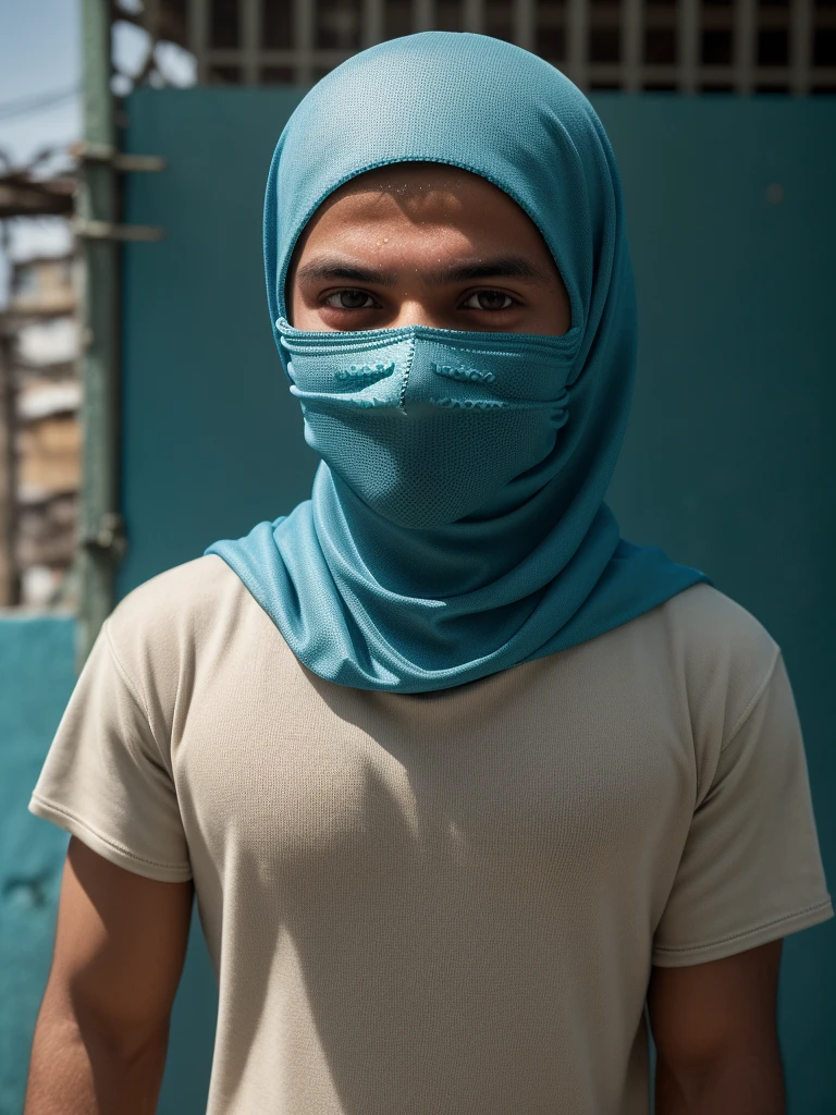 portrait of young male muslim dressing balaclava in Rio de Janeiro favela, ultra realistic, 8k full HD, low angle, unreal engine 5, cinematic, masterpiece, insane detail, real photography, bright colors, sun-soaked colours, Fujifilm X-T4, Sony FE 85mm --ar 900:1600 --s 750 --style raw --v 5. 2