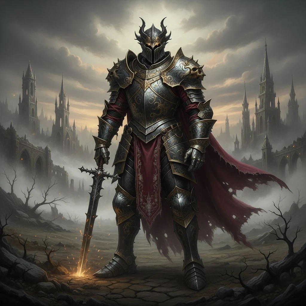 A dark fantasy knight in an ornate, medieval-inspired armor with baroque and gothic influences. The armor is weathered and richly detailed, with decorative engravings, faded red cloth, and aged metal. The environment is a moody, mist-covered landscape with ruins in the background, evoking a sense of forgotten grandeur. The color palette includes deep shadows, ochres, and muted crimson tones. The overall style is dramatic, intricate, and atmospheric, with a touch of surreal medieval fantasy