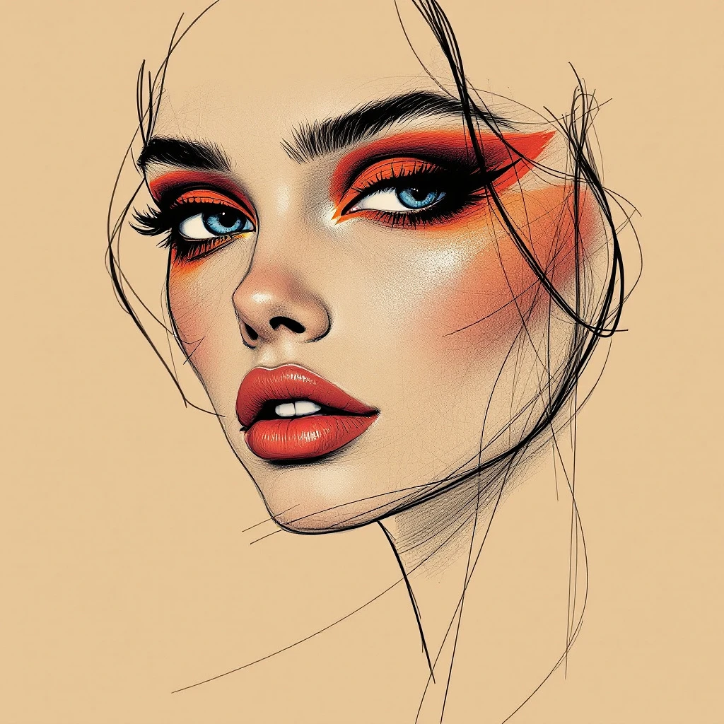 a drawing of a woman's face with a red eyeshadow, in the style of bold colorful lines, dark beige and orange, made of wire, flawless line work, captivating portraits, raw and edgy --chaos 30 --ar 1:2 --personalize 2gwf1qc --stylize 750 --v 6. 1