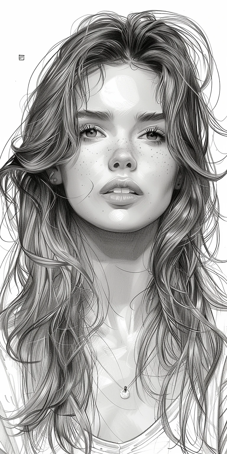 Black-and-white ink drawing of a beautiful young woman in her mid-20s with long hair, sketch focuses on the contrast between light and dark areas to create depth and texture, cross-hatching techniques for shading effects, in front view, high resolution, 30k quality, in the style of realistic black-and-white ink drawings with an emphasis on tonal contrasts created through cross-hatching --ar 1:2 --stylize 750
