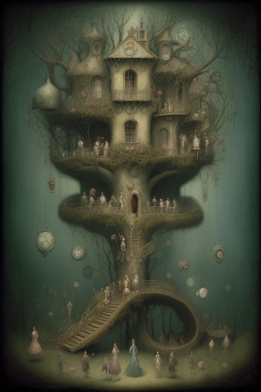 Neo Surrealism, overwhelmed by reason, by Gabriel Pacheco and Max Ernst, existential residues dark shines surrealism, a painting of a group of people in a tree house, in a high renaissance style, fantasy Victorian art, magical realism bizarre art, pop surrealism, like Alice in wonderland, whimsical art.