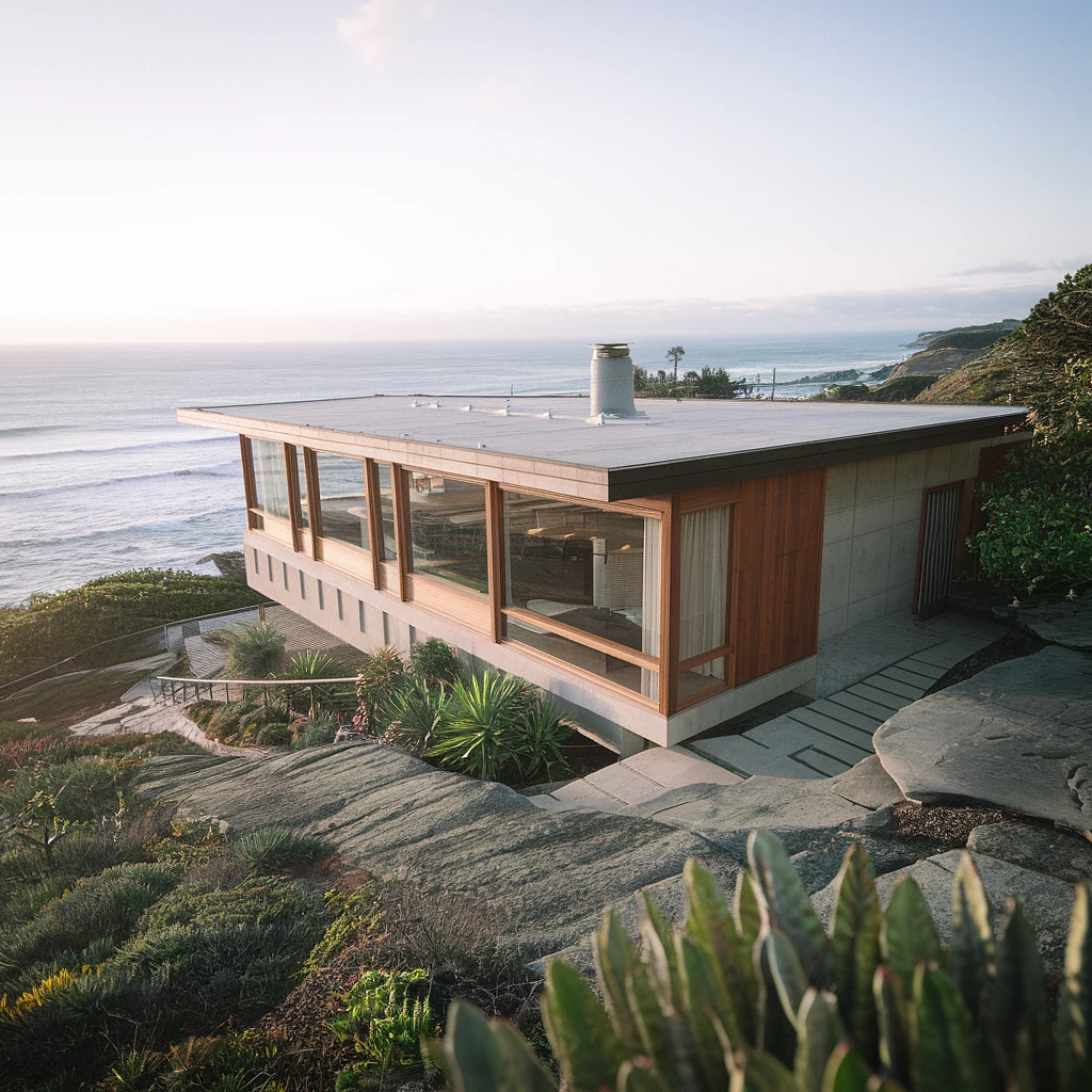 Hyper realistic eye level exterior photo of a mid century modern style house overlooking the ocean, daylight, indirect lighting, AD magazine, Frank Lloyd, Eames, Mies van der Rohe