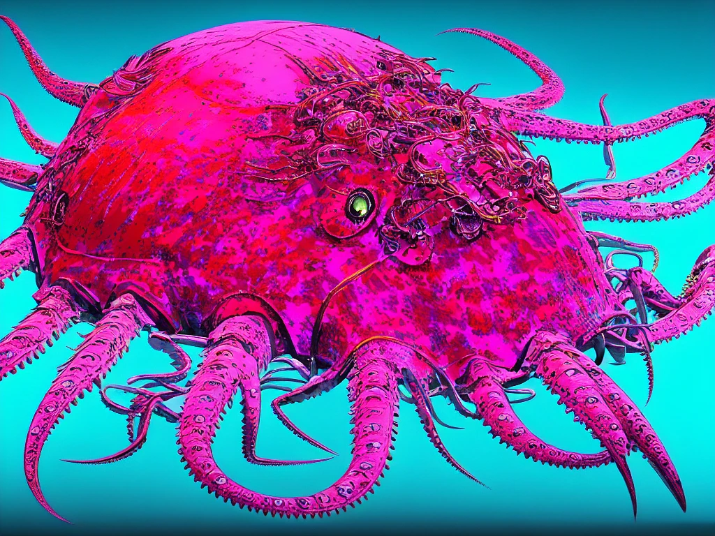 a higly detailed concept art of a cambrian era horseshoe crab octopus crow hybrid with each part scientifically labeled in japanese by charles darwin and andy warhol and moebius and greg rutkowski, dayglo pink, dayglo blue, glowing, prismatic, rendered in octane, unreal engine, trending on artstation