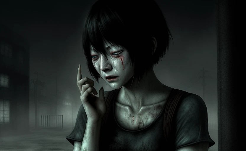 woman crying, Final Fansaty type of character, Silent Hill inspired, Fatal Frame, Versus 13, horror city background, smog