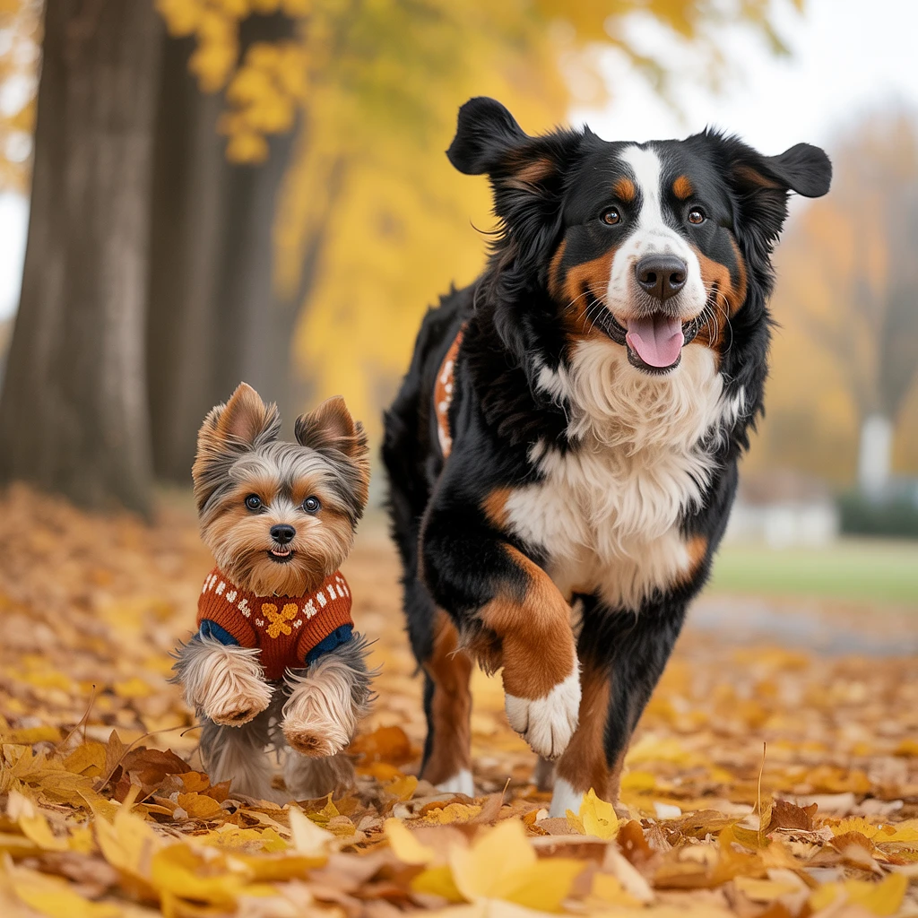 Create a highly detailed photograph of a much bigger Bernese Mountain Dog and a Yorkshire terrier frolicking and running through piles of fallen leaves in the fall. both dogs are wearing matching fall themed sweaters.