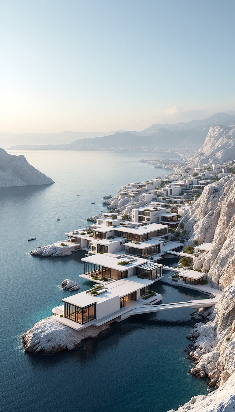 Ultra-realistic aerial cinematic view of Crimean coastline, focusing on modern luxury hotel complex. Minimalist architectural design with clean, geometric lines and flat white/gray roofs. Sleek contemporary buildings with glass facades, seamlessly integrated into coastal landscape. Pristine waterfront with architectural precision, minimal landscape intervention. Scandinavian and Japanese minimalist design influence. Sharp architectural lines, maximum transparency, neutral color palette - whites, grays, soft concrete tones. Modern infrastructure, subtle architectural bridges connecting buildings. Golden hour lighting with soft shadows, creating depth and sophistication. Hyper-detailed urban planning, 8K resolution, photorealistic architectural photography style. Emphasis on clean design, negative space, and architectural elegance. No traditional mountains, focus on smooth coastal terrain and cutting-edge architectural solutions.