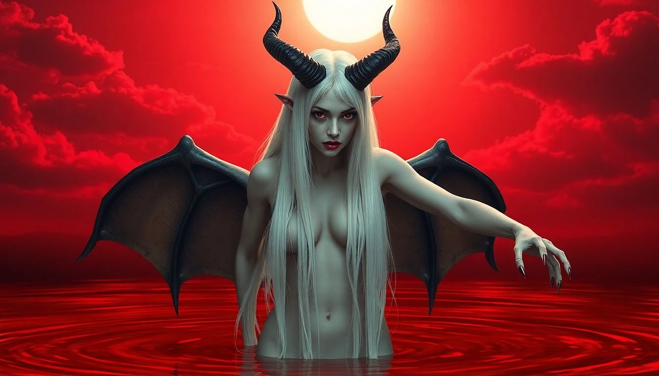 a female demon with long white hair and horns, standing in a pool of red crimson liquid. The demon has long white hair, red eyes, and dark red lips. She has two horns on her head and two wings on her back. Her nails are long and sharp. She is unadorned. She has a small earring in her left ear. She is standing in a pool of crimson liquid with her arms out to the side. The background is a red sky with pink clouds. The sun is shining down on the demon, casting a warm glow over the scene. The overall effect is one of dark fantasy and horror.