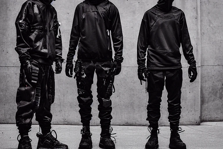 cyberpunk techwear streetwear look and clothes, we can see them from feet to head, highly detailed and intricate, golden ratio, beautiful bright colors, hypermaximalist, futuristic, cyberpunk setting, luxury, elite, cinematic, techwear fashion, Errolson Hugh, Sacai, Nike ACG, Yohji Yamamoto, Y3, ACRNYM, matte painting --w 2176 --h 3840 --iw 1