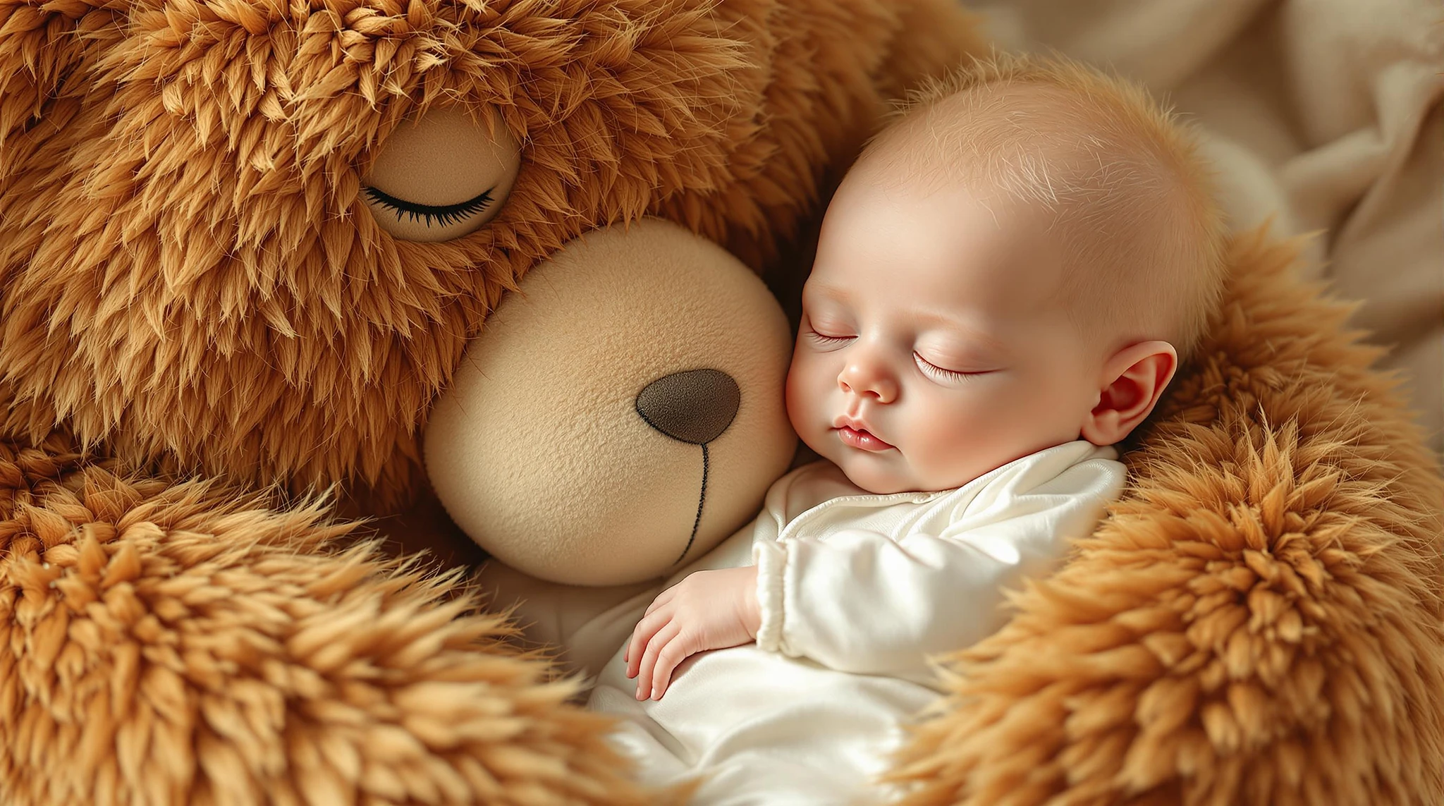 in the arms of an angel, a beautiful and (cute alien baby ) with topaz color hairs duvet , pointed ears, wearing a silk white adorable pyjamas, asleep in the arms of a plush animal, the plush animal is much larger than the baby , the thick fur of the animal is in a red earth tones colors, set against a soft, cream and white tone background that adds warmth and coziness to the scene, the atmosphere is very charming, and full of love and happiness, uhd beautiful details and textures, perfect image characters photorealistic quality