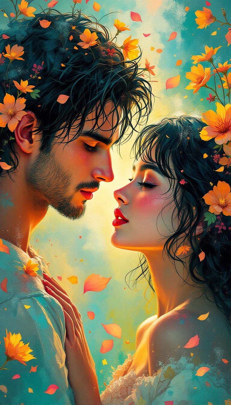 A mesmerizing, painterly-style romantic portrait of a young couple standing face-to-face, their eyes locked in an intense, emotional gaze. The man has tousled, dark, wet hair with vibrant petals and floral elements clinging to his face and clothing. His deep, expressive eyes contrast with the soft glow of his sun-kissed skin. The woman has delicate features, striking red lips, and short, wavy black hair adorned with blooming flowers in shades of orange and yellow. The background is an explosion of abstract color, blending vivid blues, greens, and warm golden tones, creating a dreamlike, impressionistic atmosphere. Tiny petals and splashes of paint-like textures float around them, enhancing the surreal, artistic quality of the piece. Their faces are softly illuminated by an ethereal glow, giving the scene a romantic and almost mythical feel. The artwork is rich in expressive brushstrokes, with a style that merges realism and fantasy, evoking deep passion and emotion. The overall composition captures the essence of love and connection in a way that feels both intimate and poetic. **Style & Quality:** ultra-detailed, impressionistic fantasy realism, vibrant painterly textures, glowing ethereal lighting **Camera & Composition:** close-up portrait, straight-on angle, intimate framing **Mood & Atmosphere:** passionate, dreamlike, artistic, emotional **Rendering Keywords:** high-definition, 4K, romantic surrealism, glowing effects, expressive brushstrokes, floral elements, fantasy love