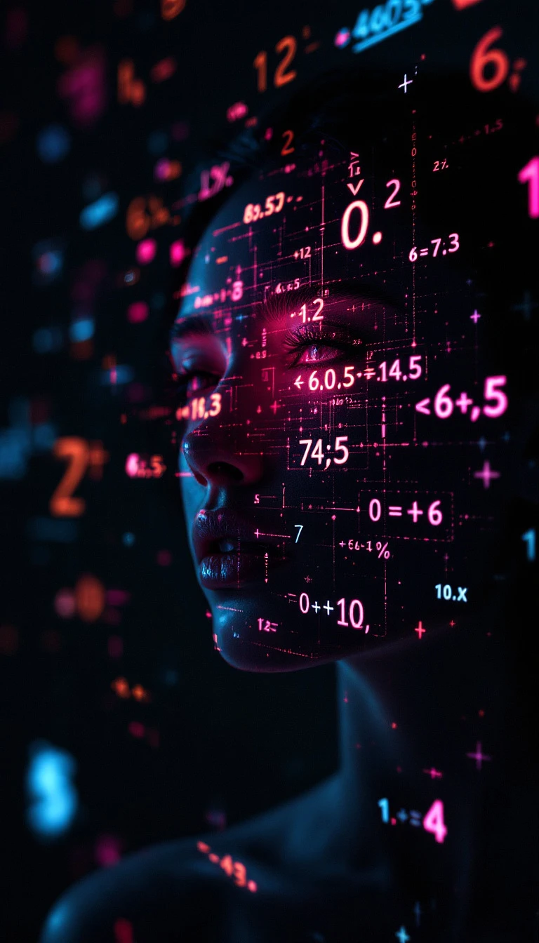 Shadowrun Math Projection with set logical ambient background, DayGlo pink black holographic equations projected Crisis Point their skin. The background is Ghost and [Egyptian|Folk] , with the equations appearing Cinestill and ever-changing, creating a World of Warcraft and perfect symmetry mood