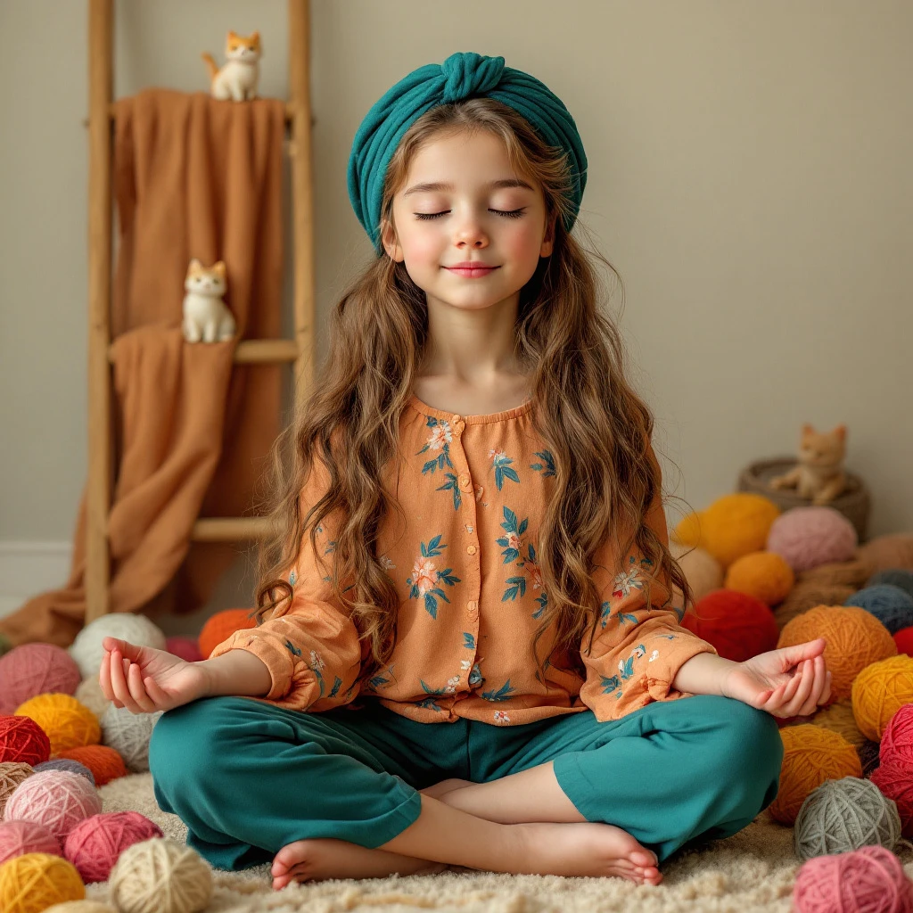 Girl, 7-10 years old, fair skin, practicing yoga pose. Long, wavy light brown hair cascading around her. She is wearing an orange/peach floral print blouse, loose-fitting teal/emerald green pants. A teal/emerald green turban tied with a bow. Peaceful expression, eyes closed, meditating. Her pose is balanced, arms holding fabric in a yoga gesture. Detailed rendering of fabric textures, showing folds and drapes of the scarves she holds and of her clothes. Wooden ladder with small cat figures climbing it. Many balls of colored yarn in different colors, creating a warm and inviting atmosphere. Natural light, warm lighting. Realistic style, detailed rendering of textures, especially hair, fabric and wool. Soft, calm and contemplative mood. Full body shot, slight tilt of the camera towards the subject. The perspective shows the girl in the center, other elements of the scene (yarn, ladder) supporting the subject and the background. Realistic rendering of skin, smooth fabric, yarn. Peaceful and meditative atmosphere.