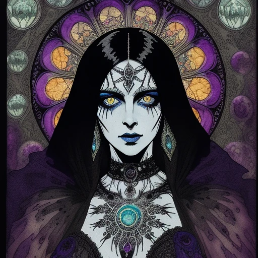Queen Of The Damned, horror, alcohol ink ink, stipple shading, volumetric lighting, gothic colors, smooth, in the style of Harry Clarke and Eugène Grasset and Alphonse Mucha