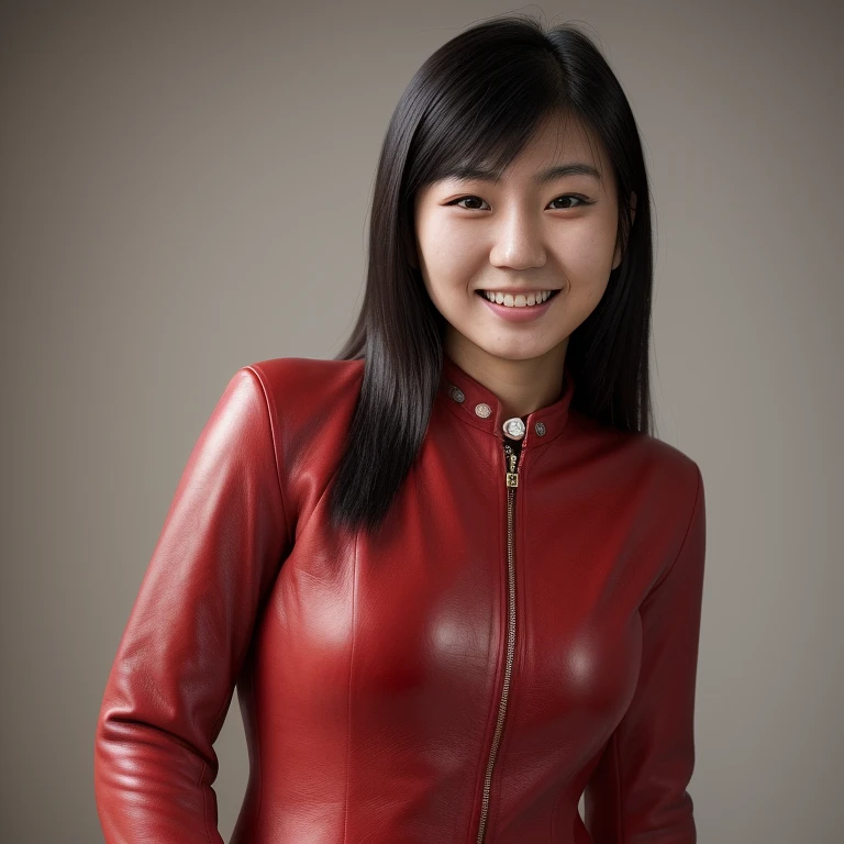 hyper realistic headshot photo of a 25 year old asian woman, wearing a red leather suit, looking into the camera smiling slightly