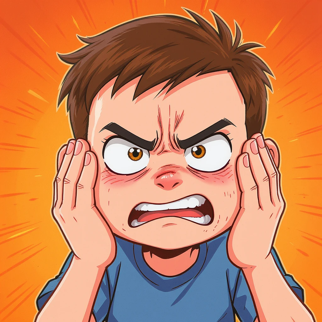 cartoon. close up shot. 14 year old boy. short brown hair and brown eyes. angry and upset. pushing closed fists into side of head.
