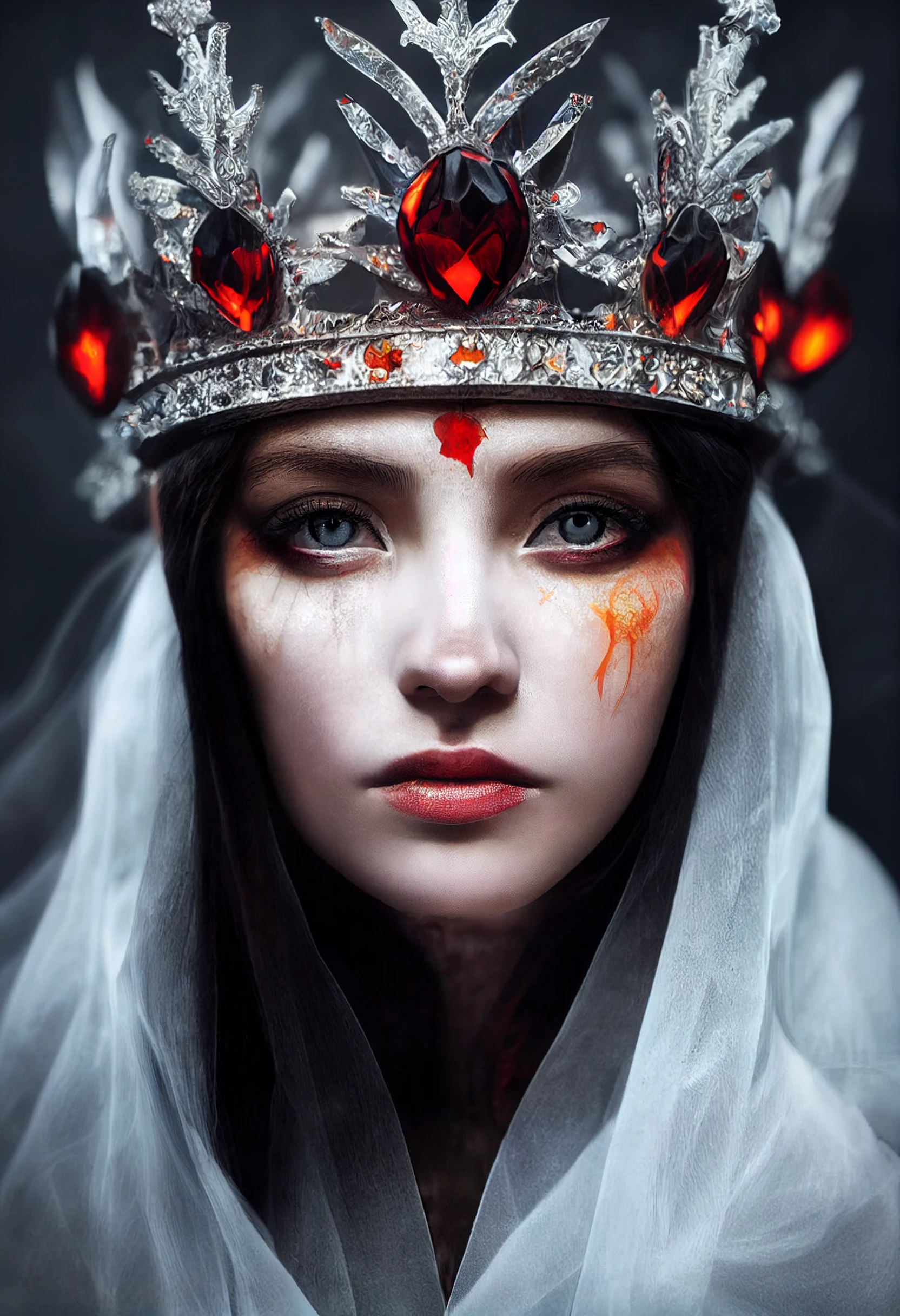 queen of fire character, crown made of crystal, dark phantasy, red tears trickle from her eyes down her perfectly white face, photorealistic, epic, dramatic lighting --testp --ar 2:3 --upbeta