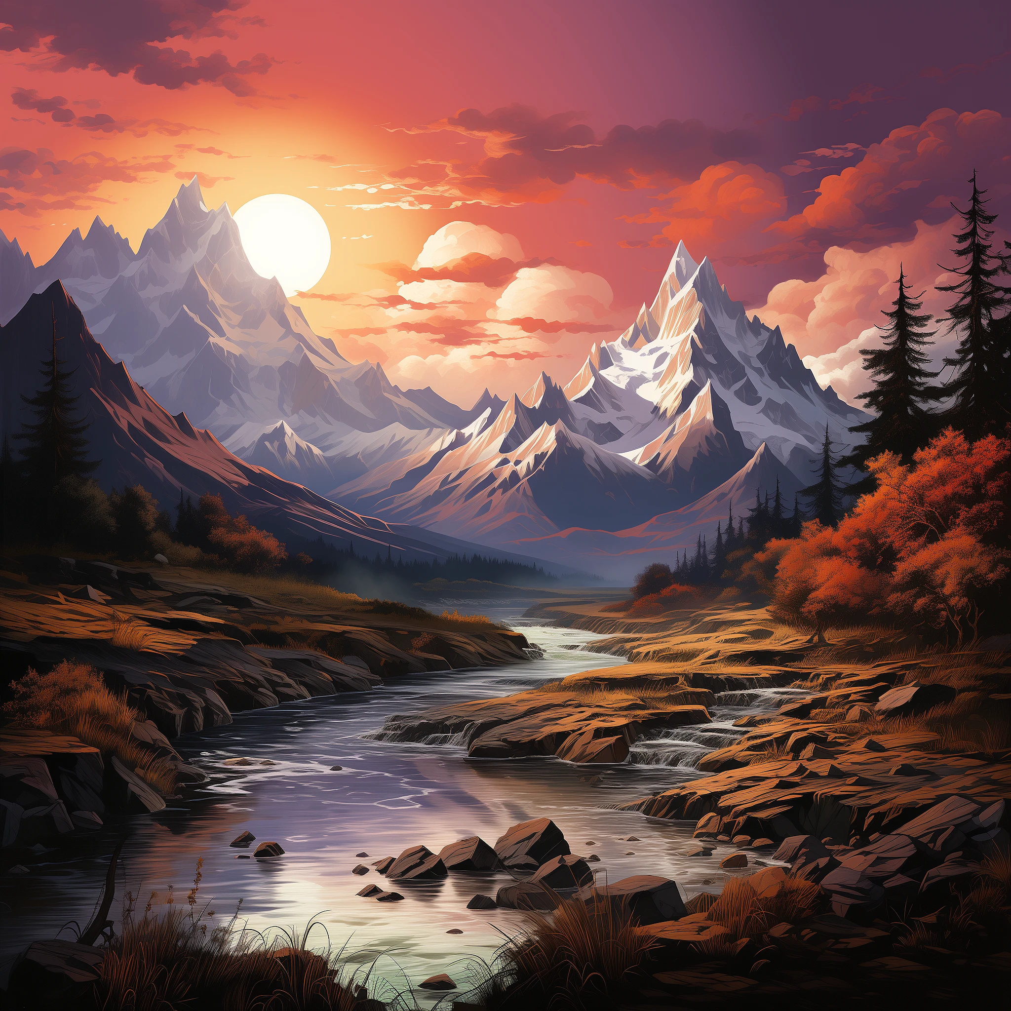 Dramatic landscape, a blend of realism and fantasy, showcasing a vast, breathtaking scene. Include towering mountains with snow-capped peaks, contrasted against a vivid, luminescent sky transitioning from deep purples to fiery oranges. Add a serene, crystal-clear lake reflecting the sky's colors, surrounded by lush, green forests. Integrate elements of fantasy such as floating islands or ethereal light beams. The atmosphere should evoke awe and tranquility, with intricate details like cascading waterfalls, ancient trees, and hidden paths to invite exploration and wonder